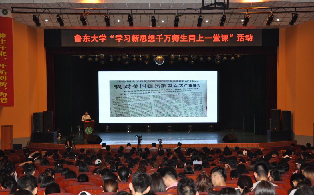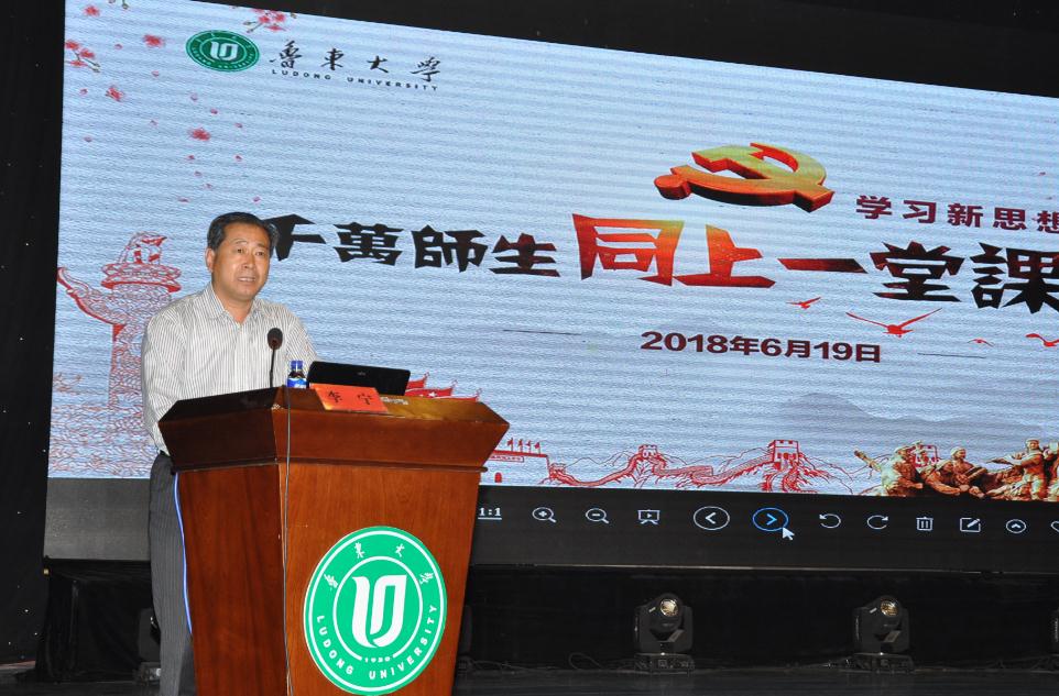 6月19日下午,我校开展“学习新思想千万师生同上一堂课”活动。山东高校习近平总书记重要讲话精神讲师团成员、外国语学院团总支副书记李宁为各学院辅导员及学生骨干700余人公开授课。校党委副书记丁瑞忠出席并主持活动,宣传部、团委负责人参加。活动通过学校官方微博、微信进行了网络直播,全校师生进行了即时收看。