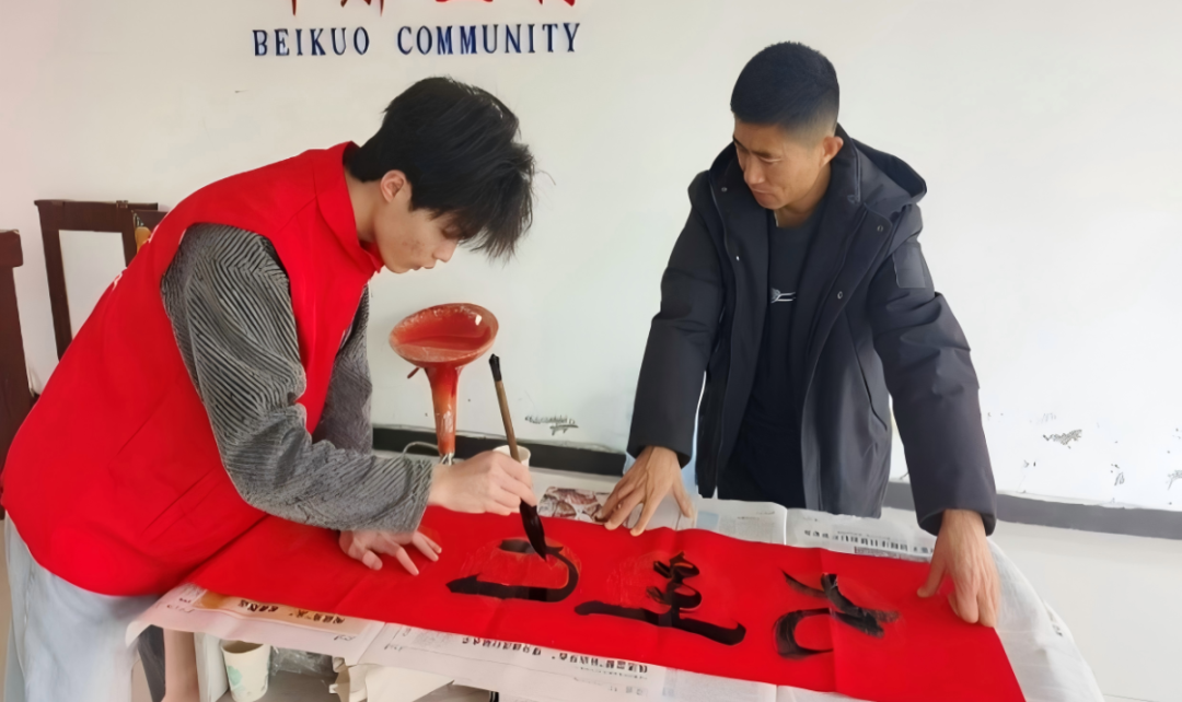 指尖非遗,传承文化根脉。社区现场,师生志愿者以匠心唤醒文化记忆:一笔一画,挥毫泼墨间将新春的喜庆与暖意送进千家万户;一针一线,扎染、竹编与壮锦的经纬里流淌着中华文脉的悠长。孩子们在指尖流转的色彩中初识传统,长者们在斑驳的墨迹里重拾年味,古老的非遗技艺穿越时空,在青春的陪伴下完成了一次温情的代际对话。